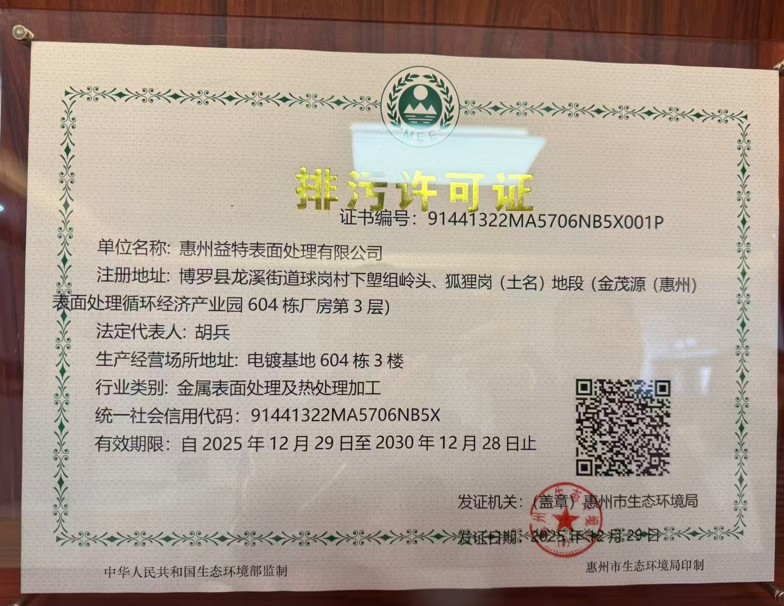 益特表面处理有限公司成功取得2025-2030年度排污许可证