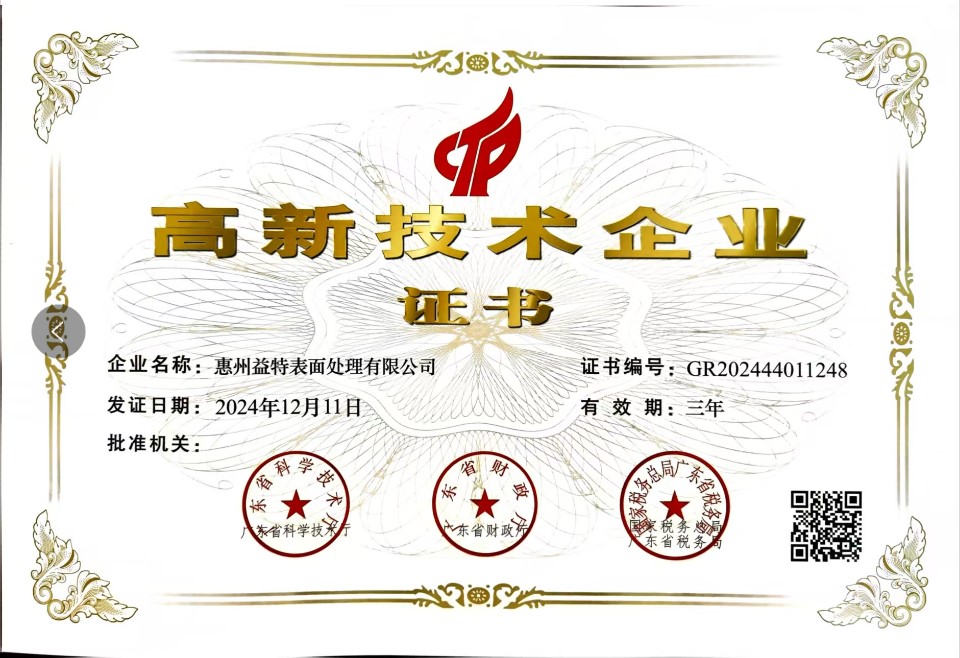 惠州益特公司荣获高新技术企业认证,以创新科技重塑电镀行业新标杆